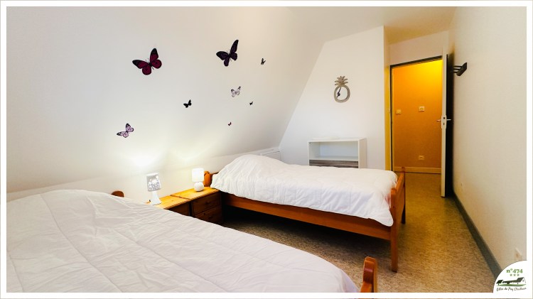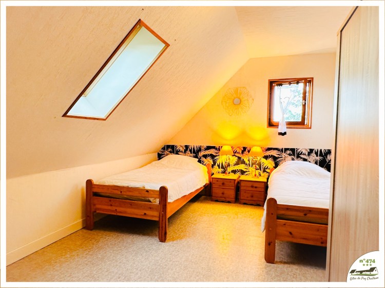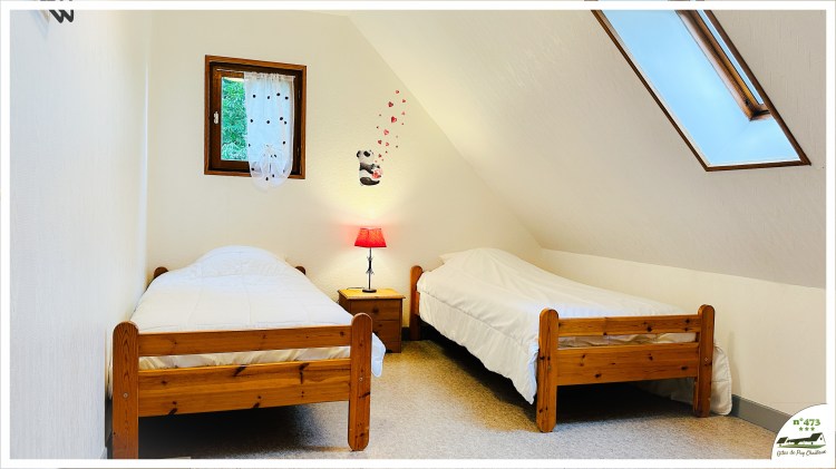 Etage : 1 chambre avec 2 couchages 90 (1 place) – 1 chambre avec 2 couchages 90 (1 place) – 1 salle de bain (douche) + WC